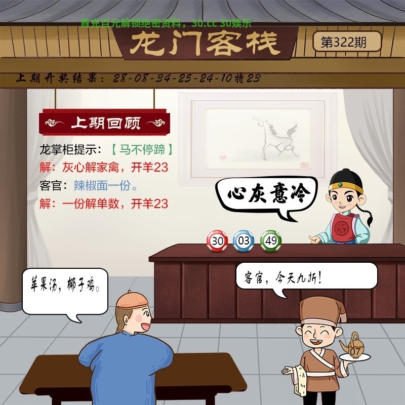 322期:【本草纲目】破解龙门客栈 掌柜:心灰意冷 解释:形容灰心丧气,意志消沉的状态 小二:客官,今天九折 解释:无 客官:苹果汤,椰子鸡 解释:椰子鸡解家禽的生肖牛、马、羊、鸡、狗、猪 特肖:牛虎猴猪兔马羊狗鸡 |